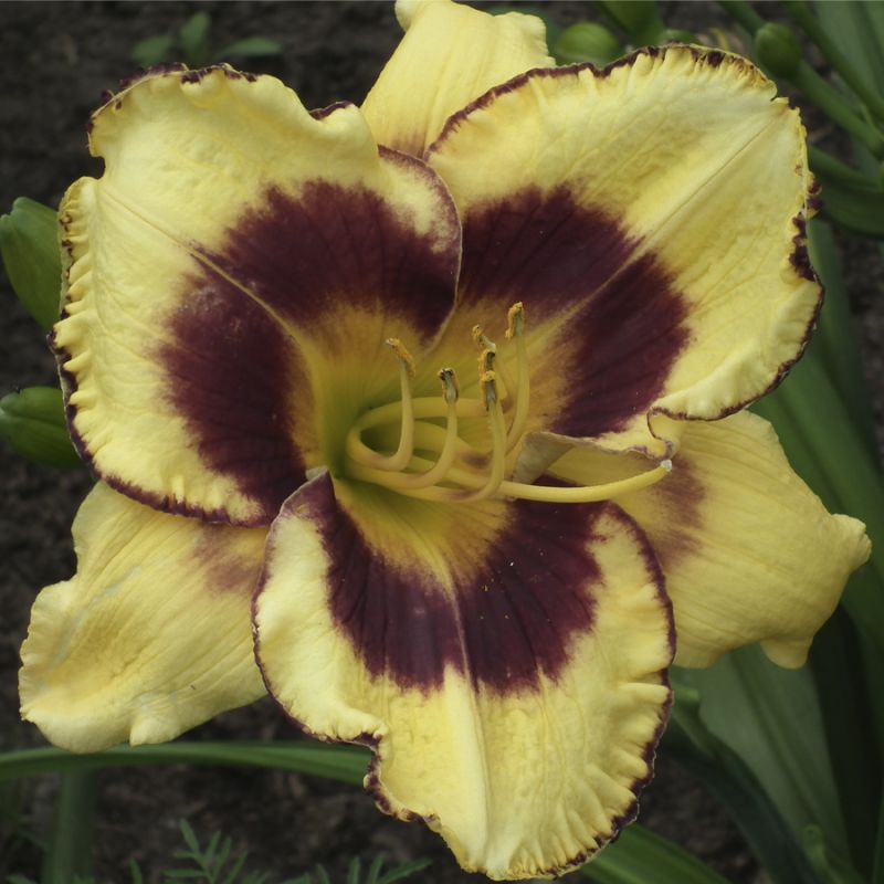Окраска цветка : Жёлтая с винно-пурпурным глазком и каймой, жёлтое горло