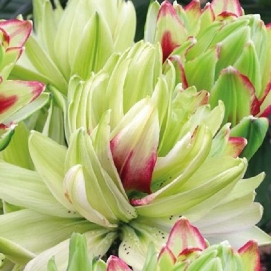 Лилия азиатская махровая "Мистери Дрим" - это настоящий загадочный сон в вашем саду! Это растение поразит вас своей оригинальной окраской цветков - светло-салатового цвета с темными вкраплениями, которые создают удивительный контраст. Высота этой лилии может достигать до 80 см, а размер цветка составляет 15-16 см. Листья имеют зеленую окраску и интересную форму.