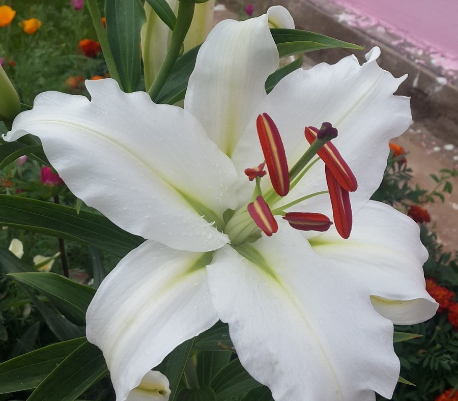 Окраска цветка : чисто-белая, нектаринки зеленые с переходом в желтые, пыльники оранжевые, рыльце серо-зеленое