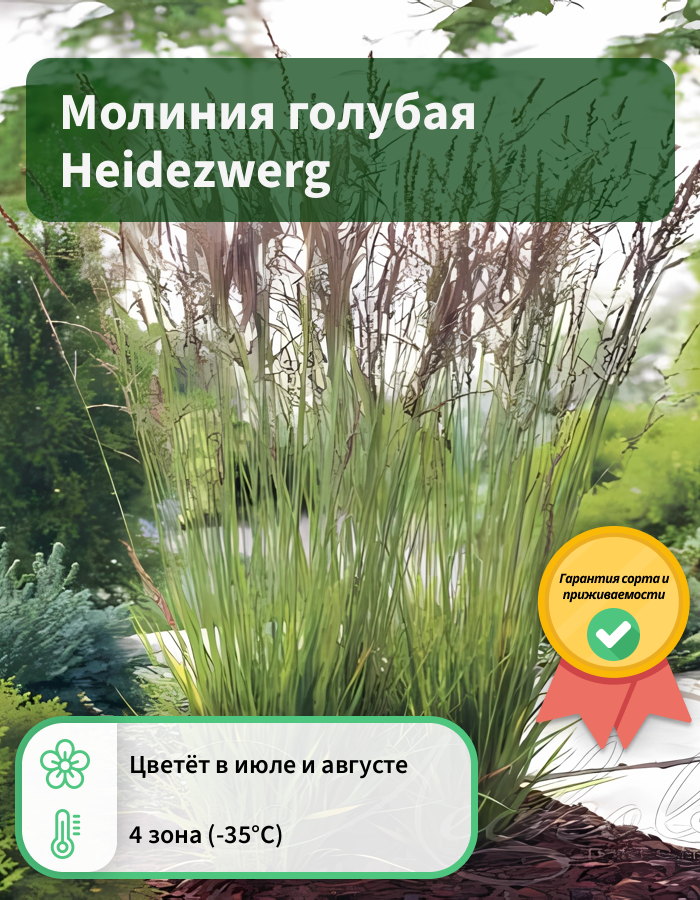 Рассада молинии голубой Heidezwerg используется для оформления садовых композиций и декоративных водоемов. Роскошный густой куст можно размещать на первом или втором плане групп. Летом среди многочисленных узких листьев появляются соцветия-метелки. Их можно срезать для составления элегантных зимних букетов. Этот декоративный сорт могут смело приобретать не только опытные, но и начинающие садоводы. Рассада молинии голубой Heidezwerg предпочитает болотные, бедные, кислые почвы, но может расти и на карбонатных. Место посадки должно быть хорошо освещено или находиться в легкой полутени.