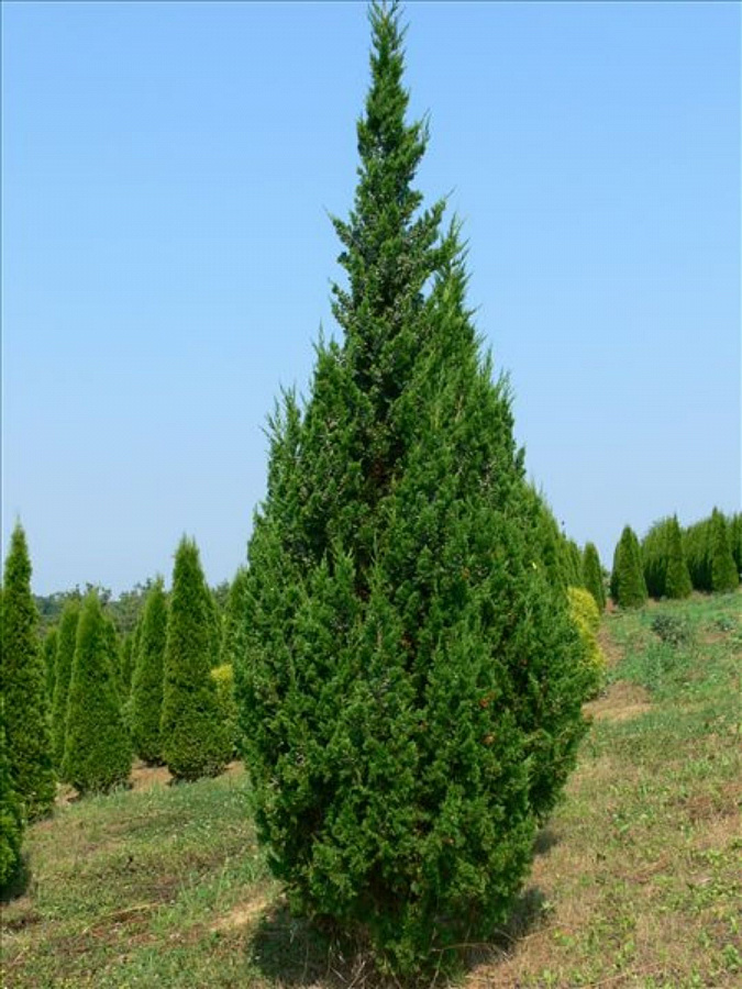 Саженцы можжевельника китайского Keteleeri хорошо растут на умеренно плодородных почвах. Участки выбирают солнечные. Сорт морозостоек, в укрытии на зиму не нуждается, нормально переносит засуху. Скорость роста умеренно быстрая: за год прирост в высоту составляет около 15 см. Ширина кроны около 1,5 метров. Максимальная высота дерева 8-10 метров. Хвоя чешуевидная, светло-зеленая, с эффектным восковым налетом, заостренная. Используется можжевельник китайский Keteleeri не только в одиночных и групповых посадках. Дерево часто высаживают вдоль аллей и для создания живых изгородей.